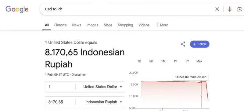 Jakarta, LINKNEWS – Nilai tukar rupiah terhadap dolar Amerika Serikat (AS) yang tercatat di situs pencarian Google tiba-tiba menunjukkan angka Rp 8.170,65 pada Sabtu (1/2/2025). Angka ini ternyata merupakan kesalahan, mengingat data yang muncul adalah nilai tukar pada 1 Februari 2009, yang mengindikasikan adanya kendala teknis atau error dalam penyajian informasi.